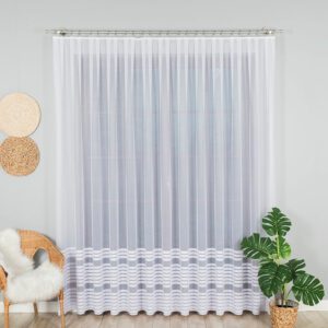 Firanka żakardowa o wysokości 250 cm w kolorze białym to elegancki i funkcjonalny dodatek do każdego wnętrza. Wykonana z wysokiej jakości żakardowej tkaniny o gramaturze 82 g/m², cechuje się trwałością oraz estetycznym wyglądem. Dzięki 100% składowi poliestrowemu firana jest łatwa w utrzymaniu i odporna na zagniecenia. Jej delikatna struktura zapewnia