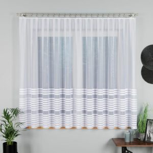 Firanka żakardowa Markizeta Home – 330 cm wysokości, wzór pasowy Elegancka firanka żakardowa z pasowym wzorem to idealne rozwiązanie dla osób ceniących stylowe i klasyczne dekoracje okienne. Wykonana w 100% z wysokiej jakości poliestru, jest trwała, łatwa w pielęgnacji i doskonale przepuszcza światło, tworząc przytulną atmosferę w pomieszczeniu. Cechy produktu: